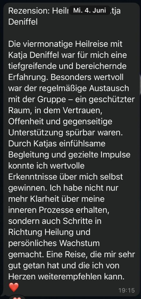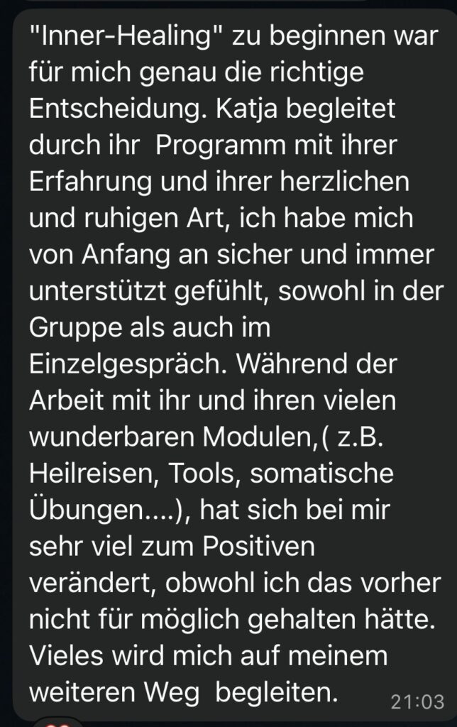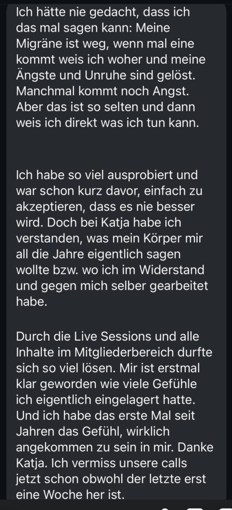 Die Zusammenarbeit mit Katja war für mich sehr bereichernd. Ich hatte schon seit vielen Jahren immer wieder Magenbeschwerden, litt an starker Eifersucht und war so negativ eingestellt. Es war schon zu meinem Normalzustand geworden. Leichtigkeit kannte ich nicht mehr und fand es auch irgendwie doof zu sehen, wenn andere happy waren. Seit ich intensiv im Kurs gearbeitet habe und mich mit meinen Themen und all den Methoden beschäftigt habe, kann ich auf einmal sagen, es fühlt sich wieder leicht an in meinem Magen, ja einfach in mir. Ich habe unglaublich viel gelernt. Danke danke.