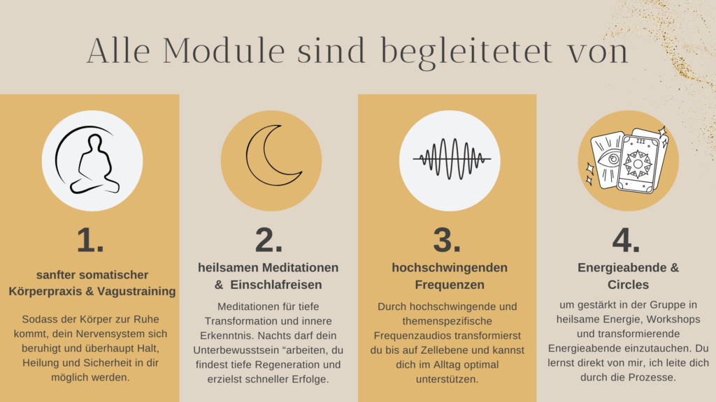Hier verbindest du dich neu mit dir selbst. Du regulierst dein Nervensystem, lernst energetische Methoden, um in deiner Kraft zu sein und löst tiefsitzenden inneren Stress aus deinem System. Eine wichtige Vorbereitung für deine weitere Heilreise. Denn ohne diese tiefe Ruhe zu integrieren, ist Heilung kaum möglich.